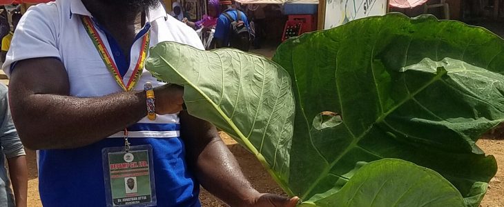 Treating the external piles with cocoyam leaves, to make external extrusion of the anal muscles go back without side any effects.